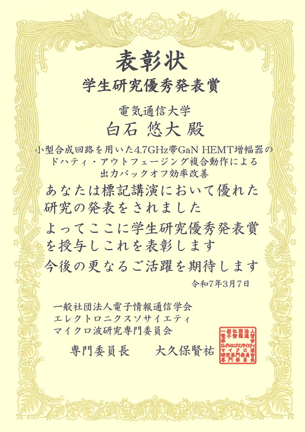 2025年3月6日(木)、7日(金)に島根県出雲市で開催された電子情報通信学会マイクロ波研究会内において表彰されました。